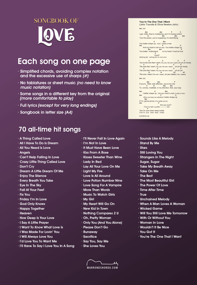 70 all-time hit songs for guitar and ukulele, in letter size (A4), each song on a single page!